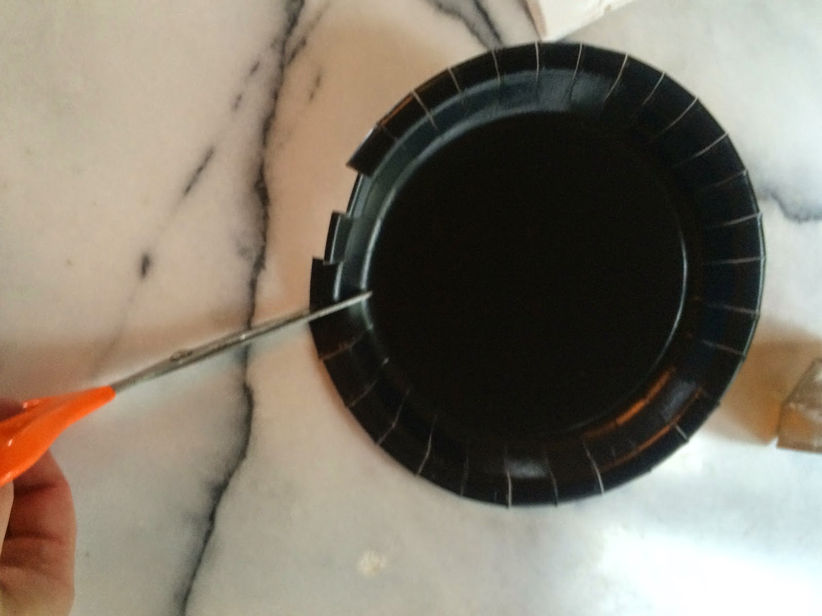1. Take the black paper plate and begin making slits around the edge of the plate. Slits should be @1/2 to 3/4″ deep. Leave @ 3/4″ between slits. This is a great exercise for children who are learning to use scissors. You could also pre-cut the slits, which I did for my 2 and 3 year old grandkids.