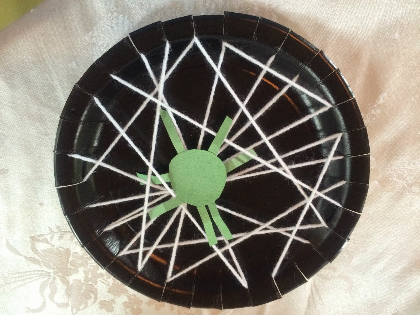 My favorite one, the paper plate spider web, is the one I will describe here. It gives children a tactile experience, works their small motor skills and looks great once it’s finished.