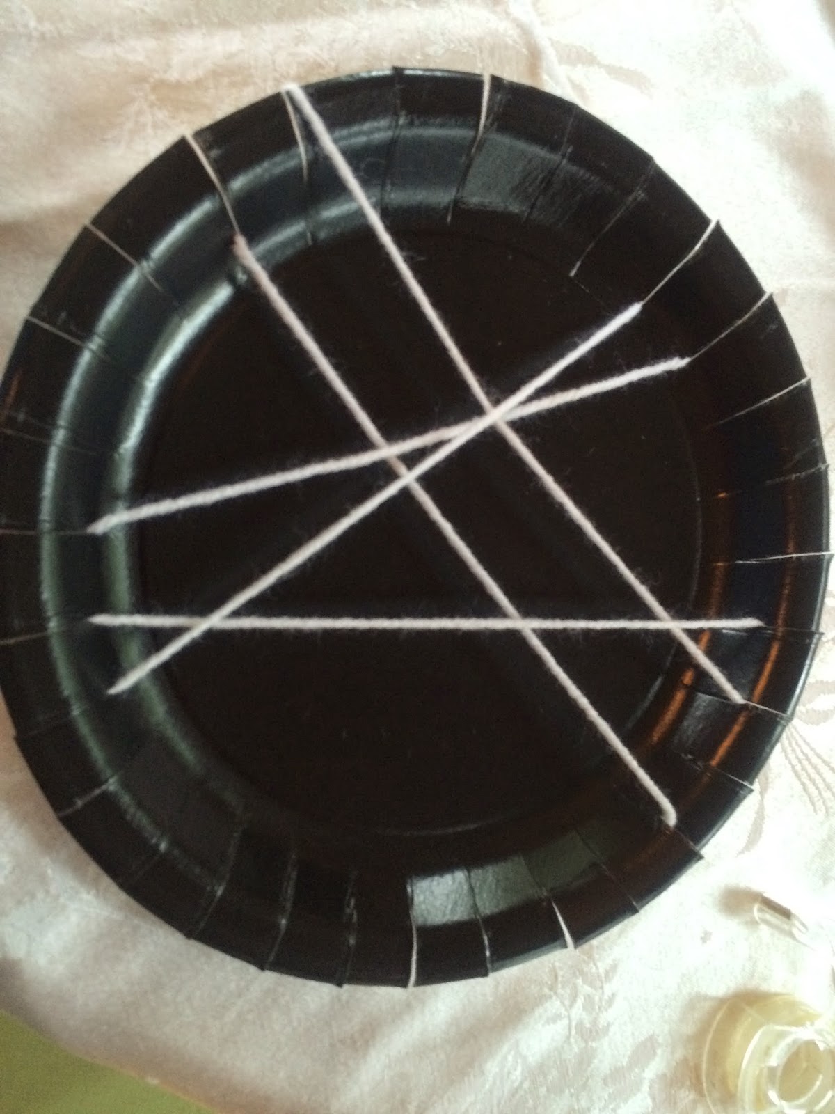 2. Tape one end of the white yarn to the back of the plate.