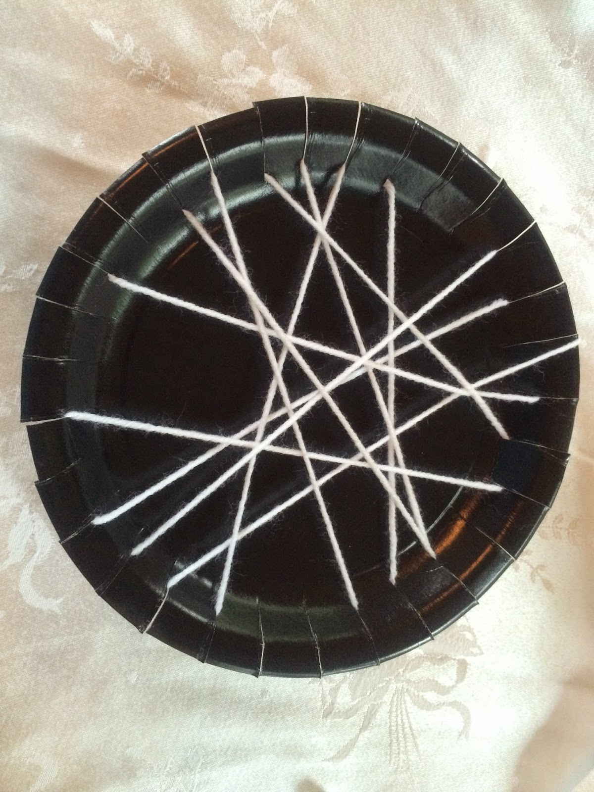 - Black paper plates (white can be substituted but you’ll have to reverse the color of the yarn.)