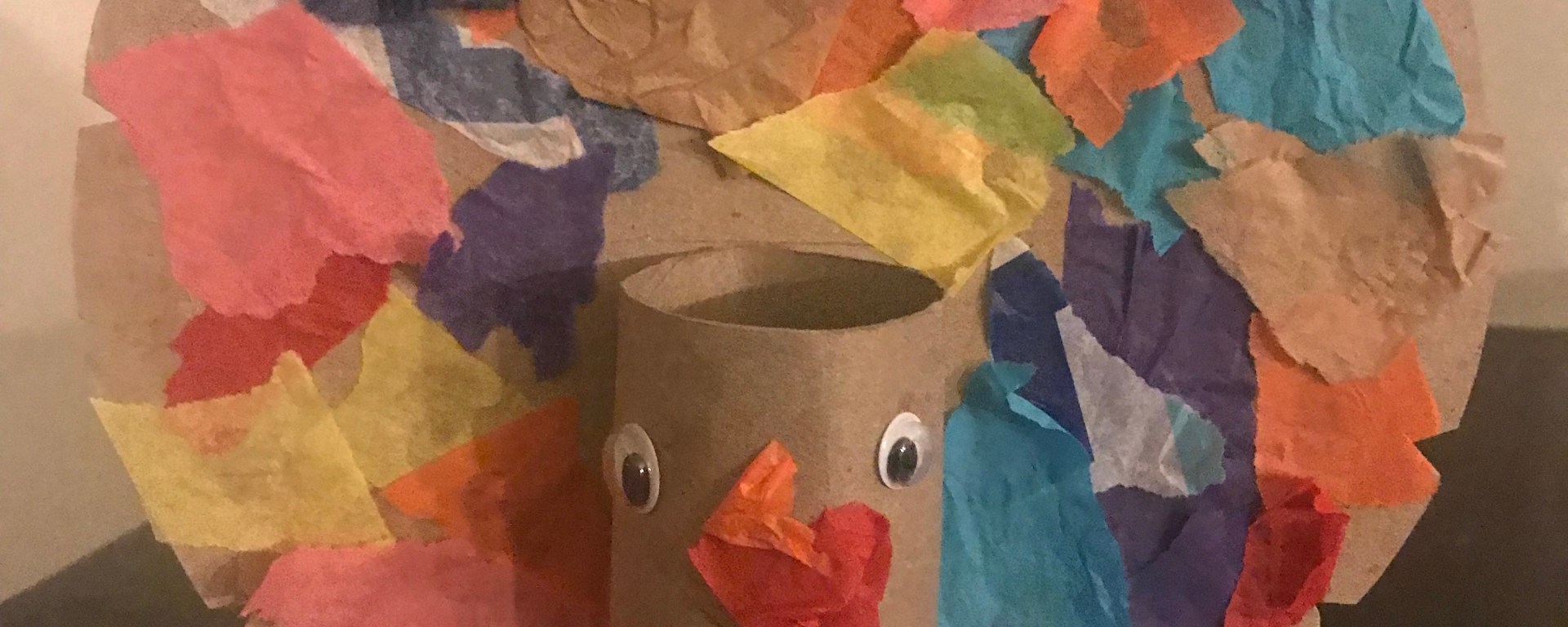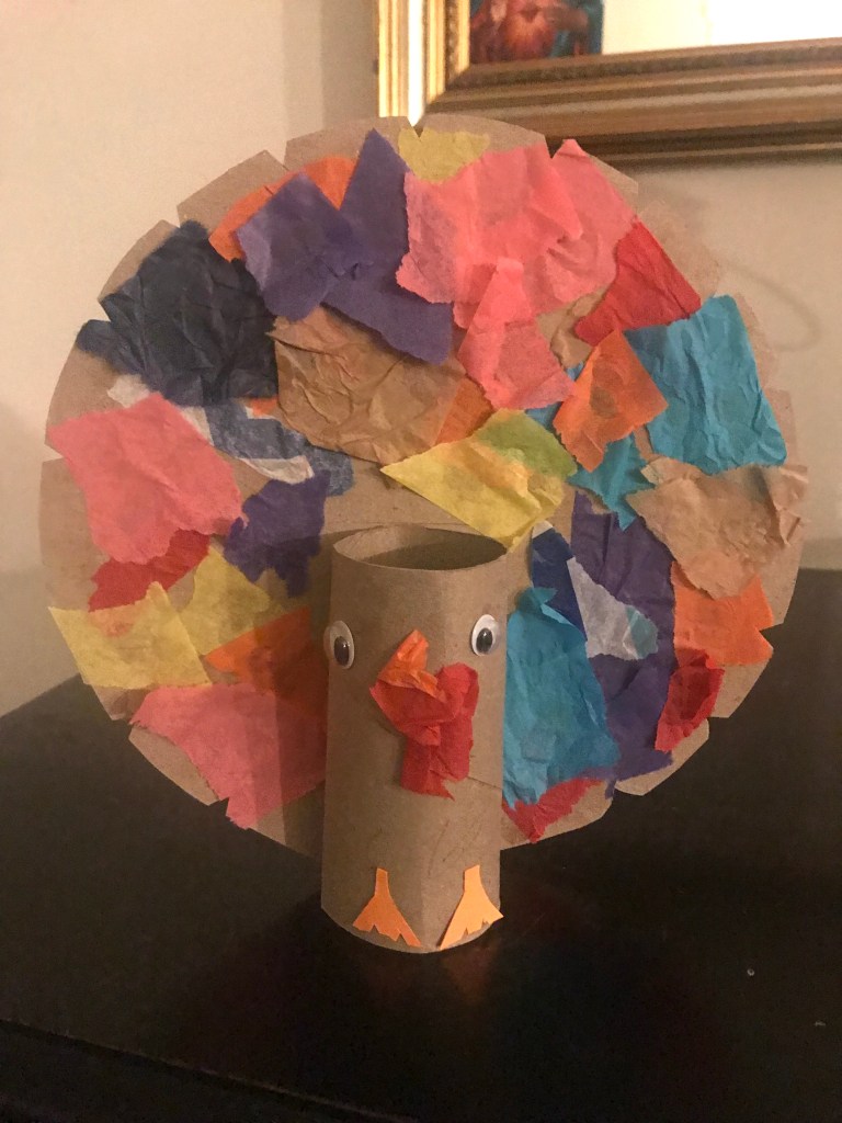 This craft was done on the fly, with materials I had in the house. Oh, you don’t have tissue paper, glue and toilet paper rolls handy? Improvise! The kids won’t know the difference!