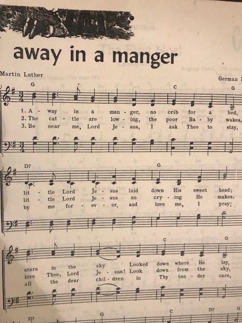 Her music book with cheery Christmas songs.