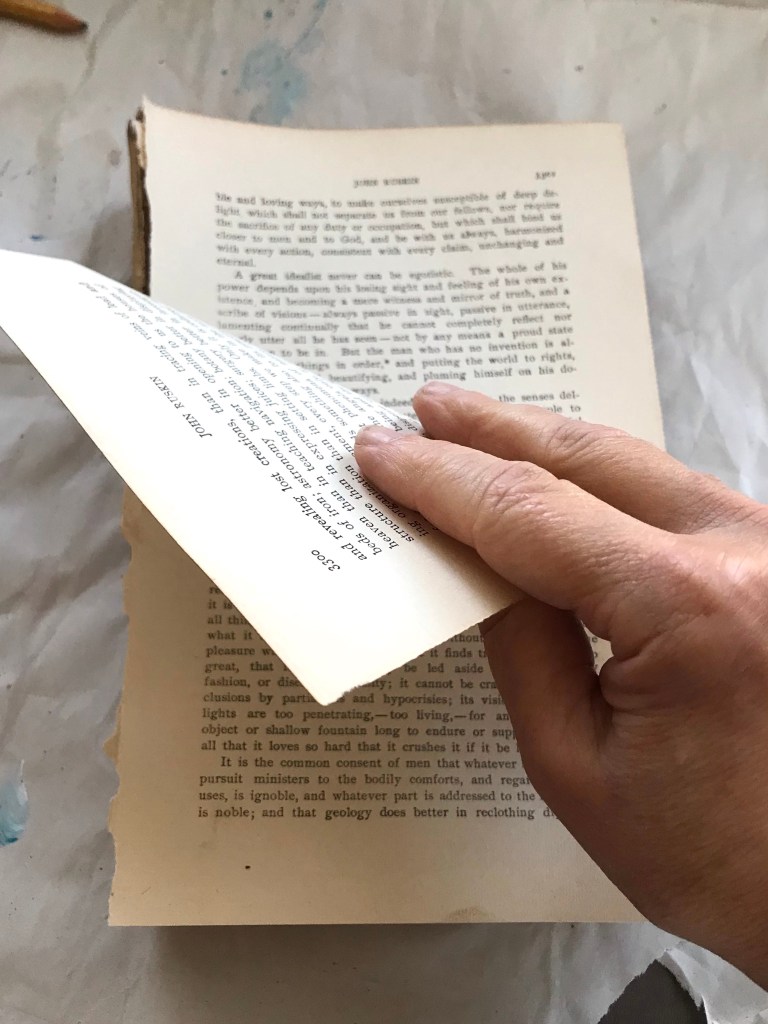 One day, while visiting Occoquan, I saw a wreath in a shop window. Of course I had to go inside and explore. Looking closer, I saw they made the wreath from the pages of a book. Aha! That’s what I’ll do with those yellowed, deckle-edged pages from those lovely old books.