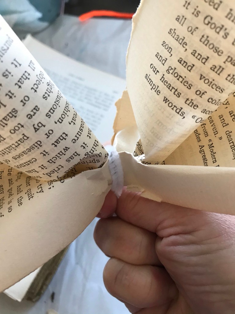 2. Tear out the pages of the book. If your book is old, as mine is, it tears easily. This becomes part of the effect of the wreath.