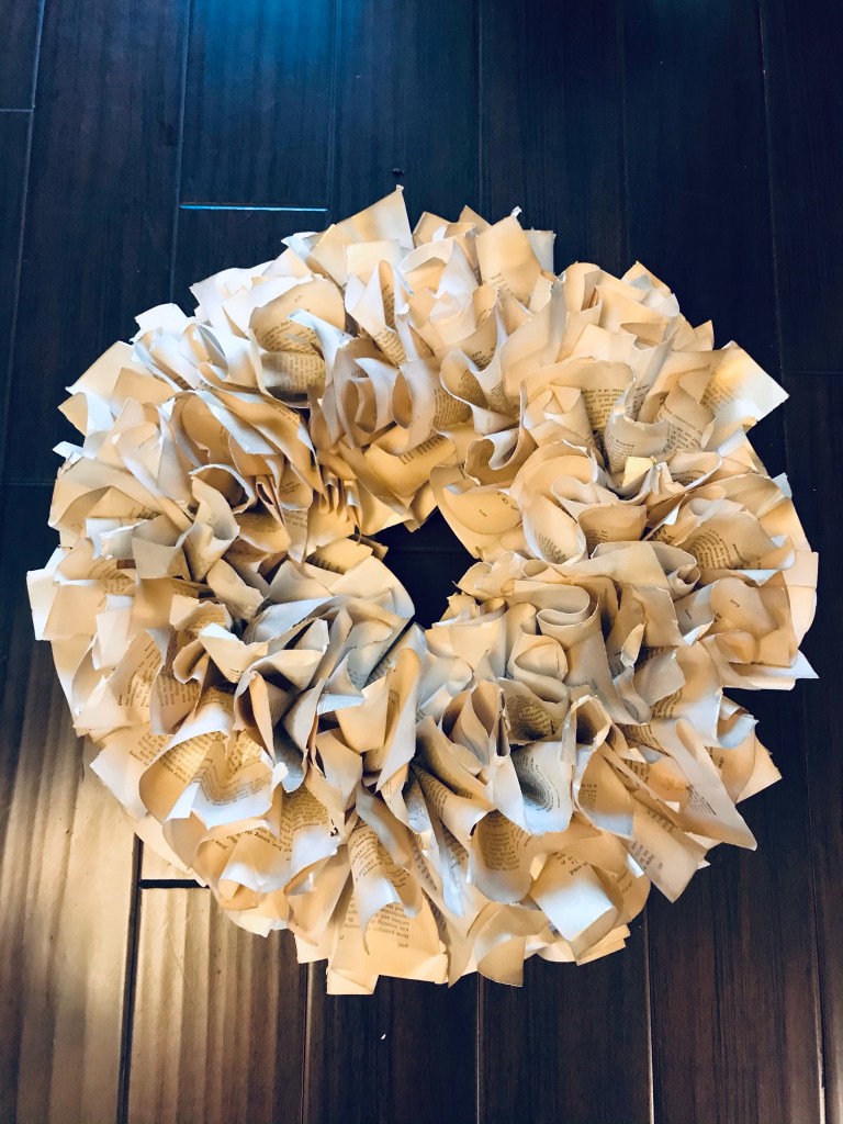 5. Continue doing this until the wreath is as full as you would like it. Turn it over to the front and look for holes where you could add more pages to fluff the wreath even more.
