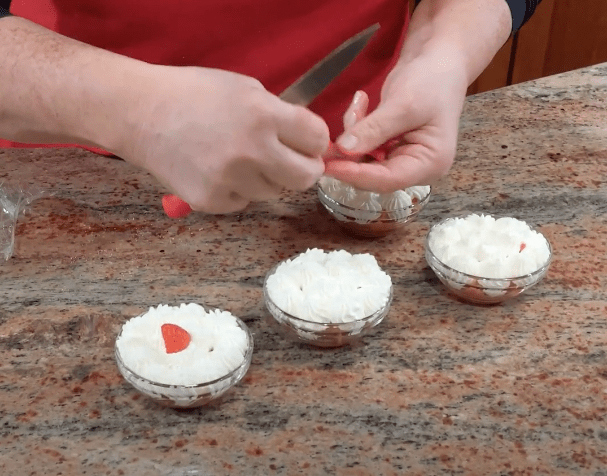 Cut the rest of the strawberries retaining a few uncut to decorate. Add 1 tablespoon of sugar and the juice of 1/2 lemon. Set aside until ready to assemble.