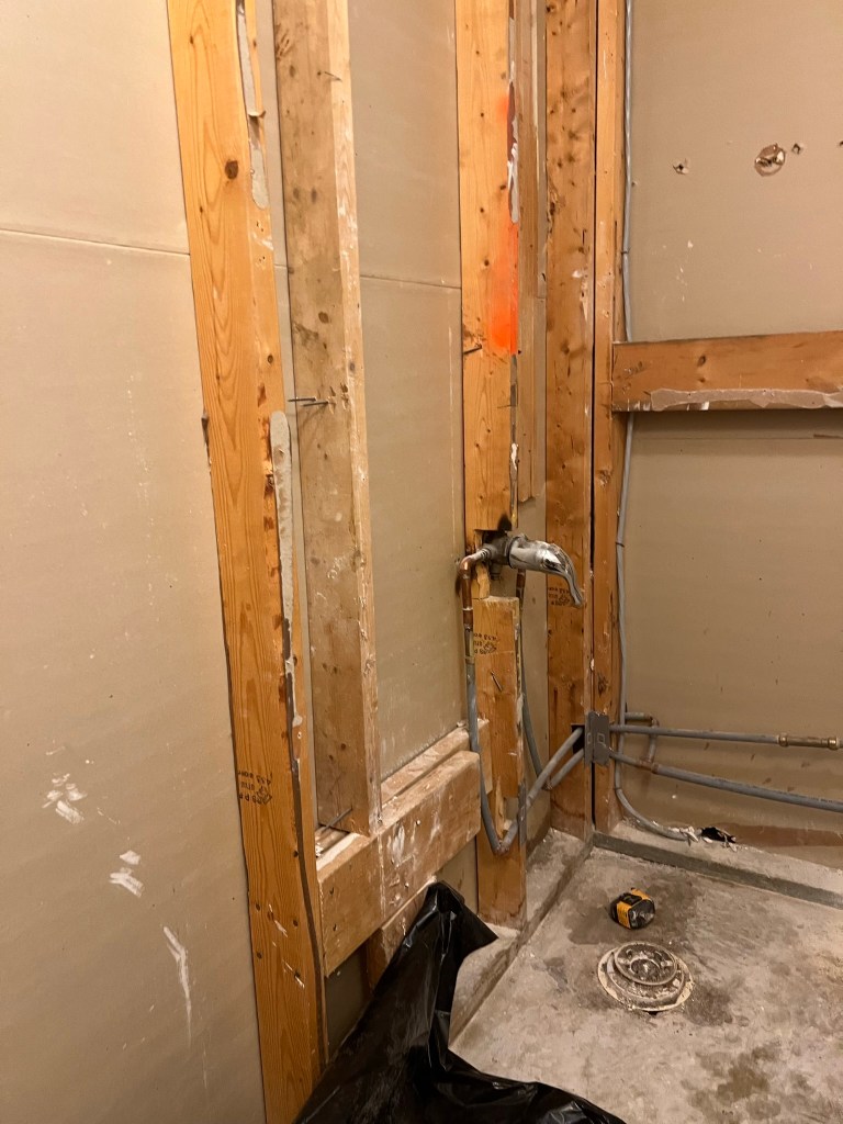 Below is a photo of Arthur manning the tiller. The weather was a gorgeous 80’s on a fall day. The next photo is the bathroom bare bones – down to the studs. And the last photo is the new drain being put in!