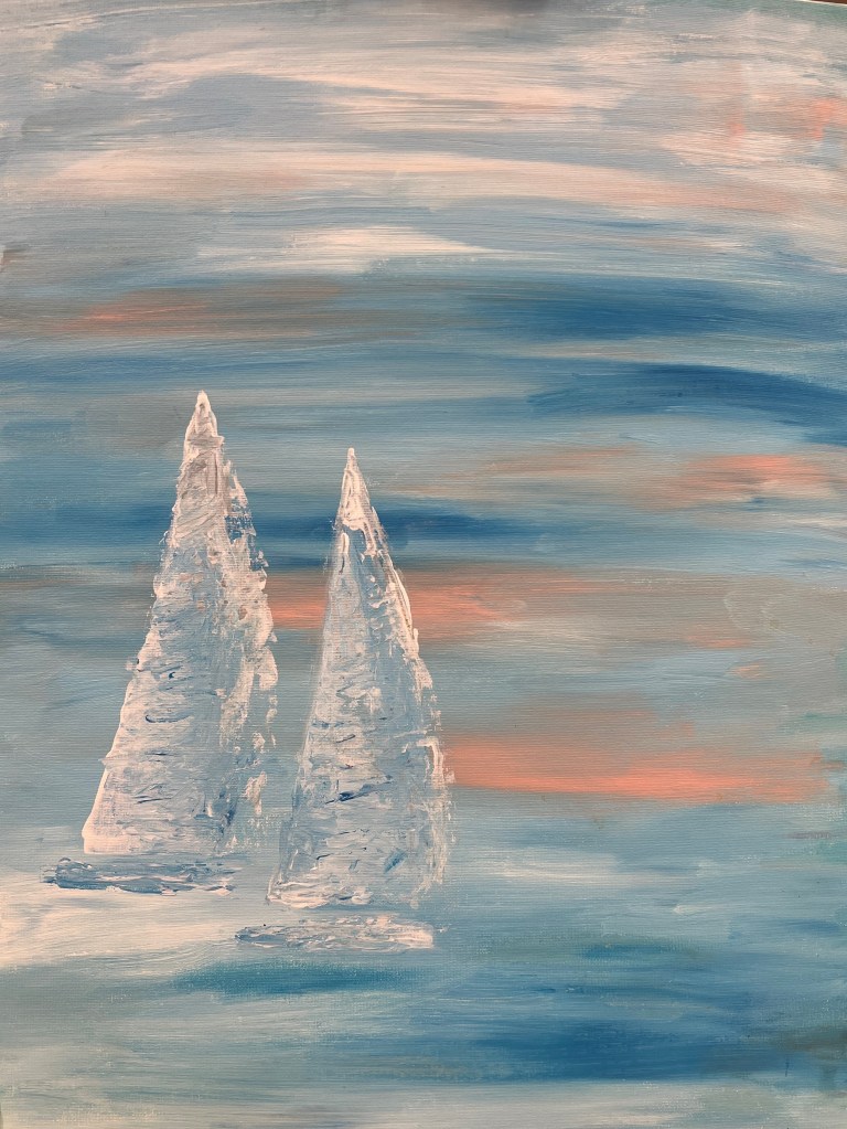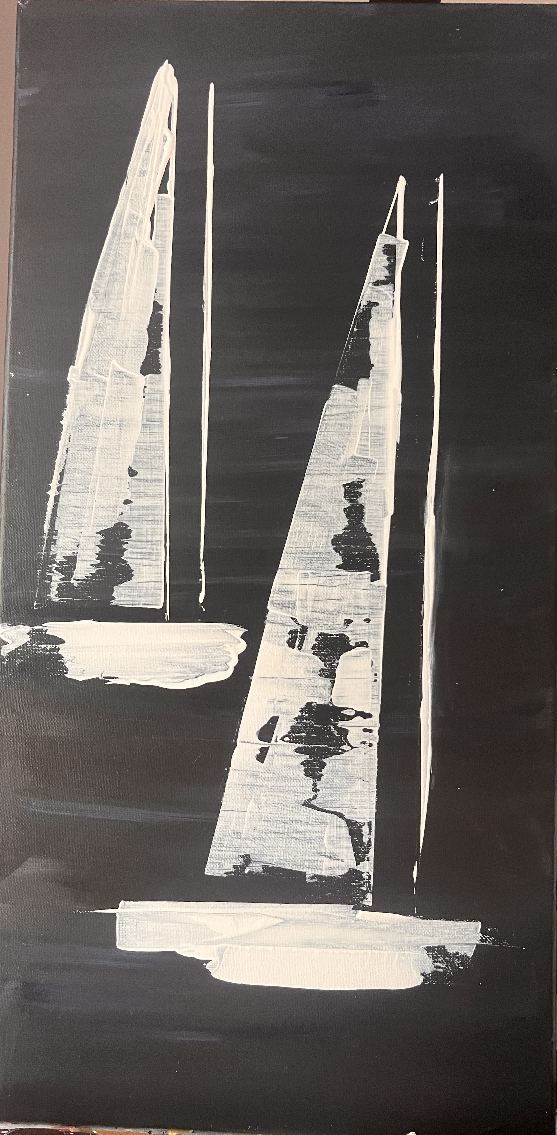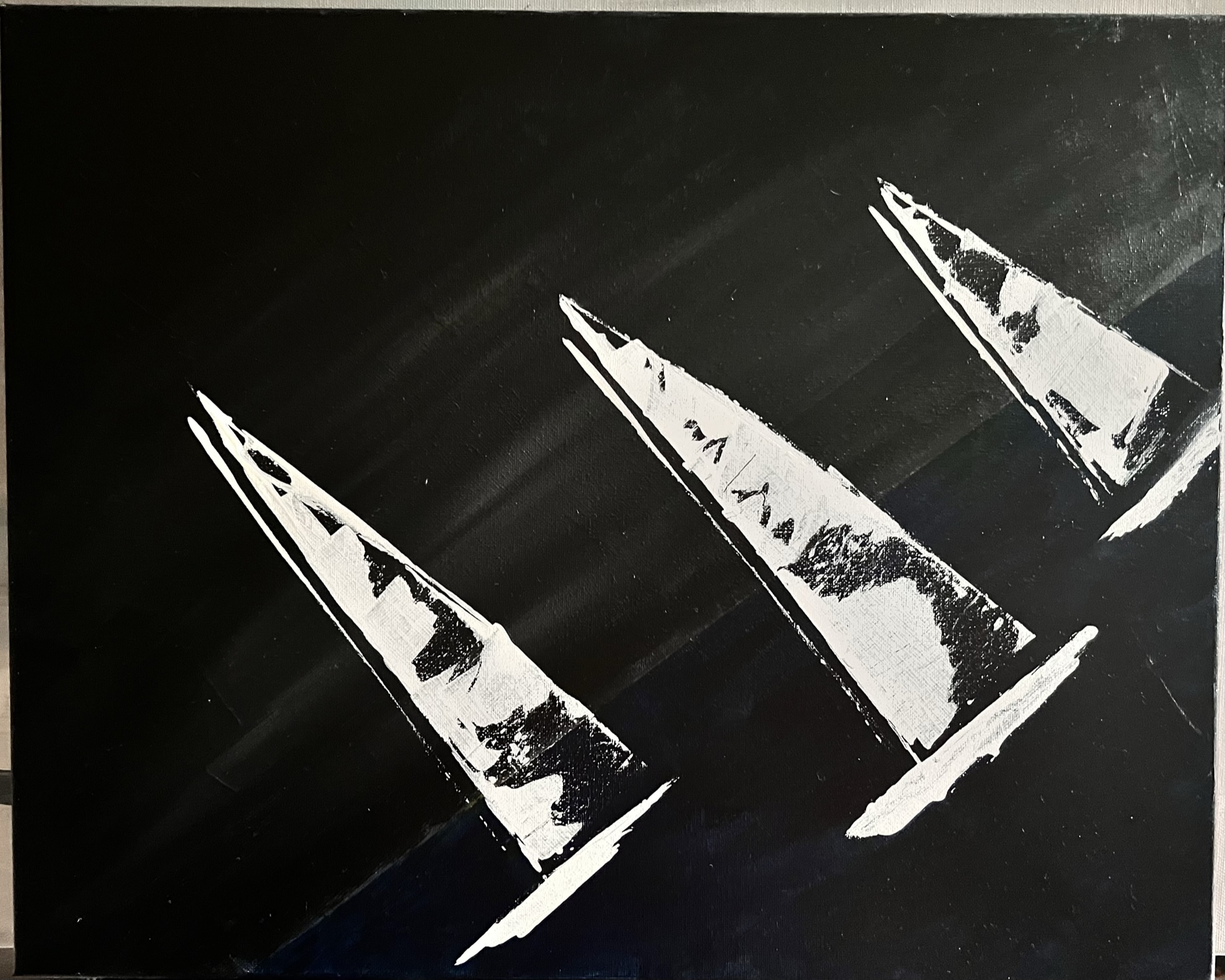 White ghost ships sailing across an inky black/navy sea. Acrylic on Canvas 24×16 (?)