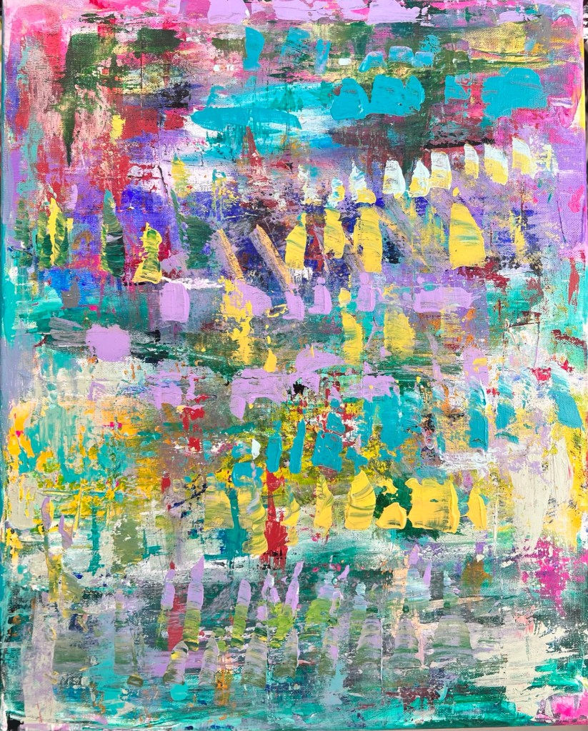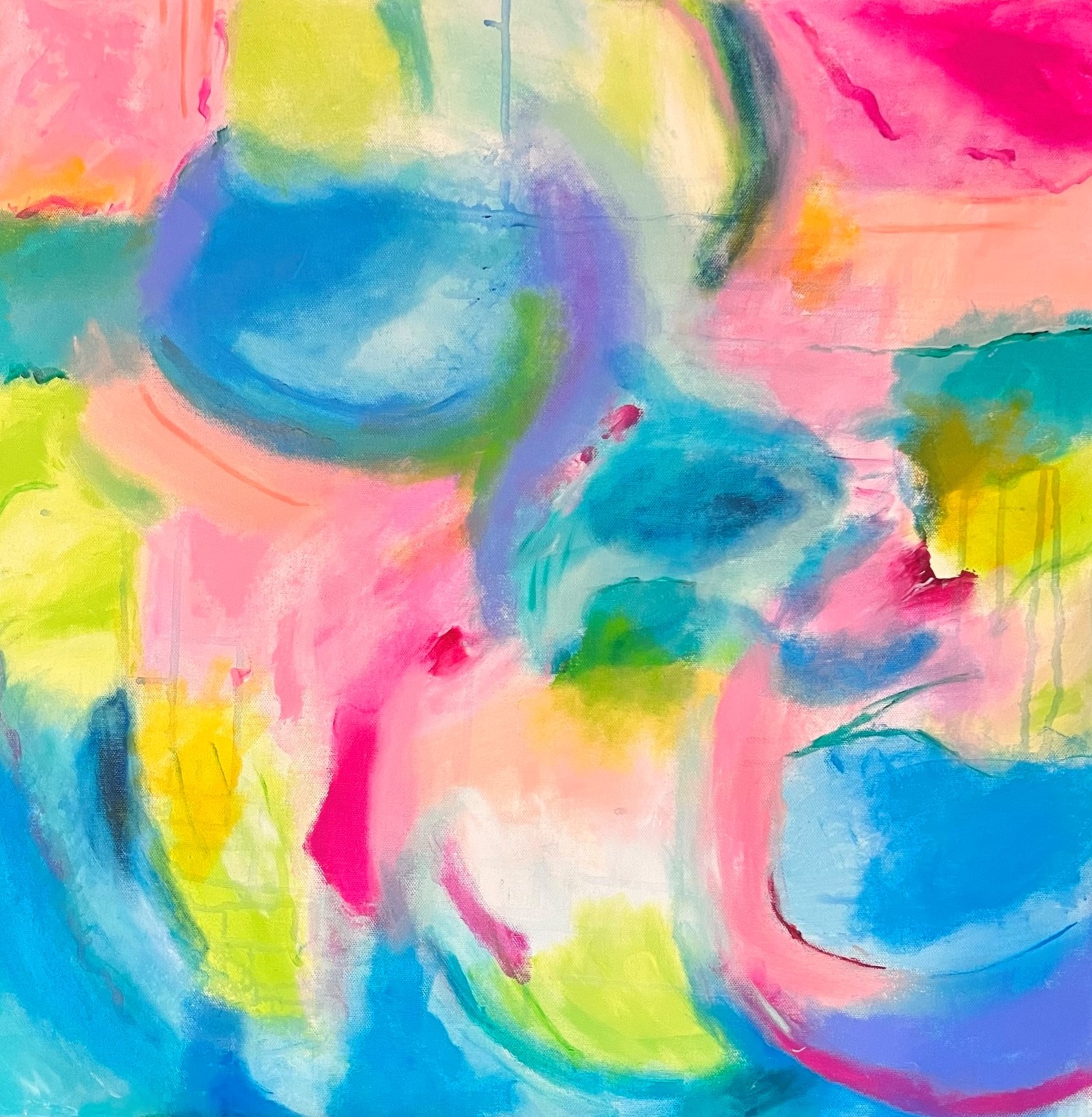 Pinks, blues and yellows dance and float creating a happy airy scene. Sweet like cotton candy. 24 x 24 Acrylic on Canvas Shipping is additional, based on zip code.