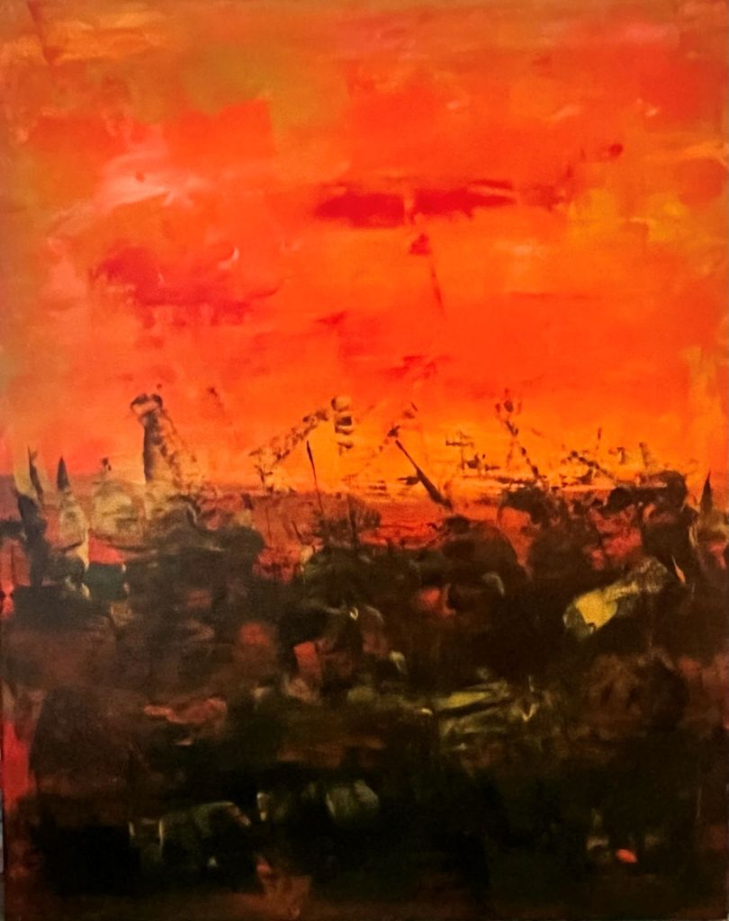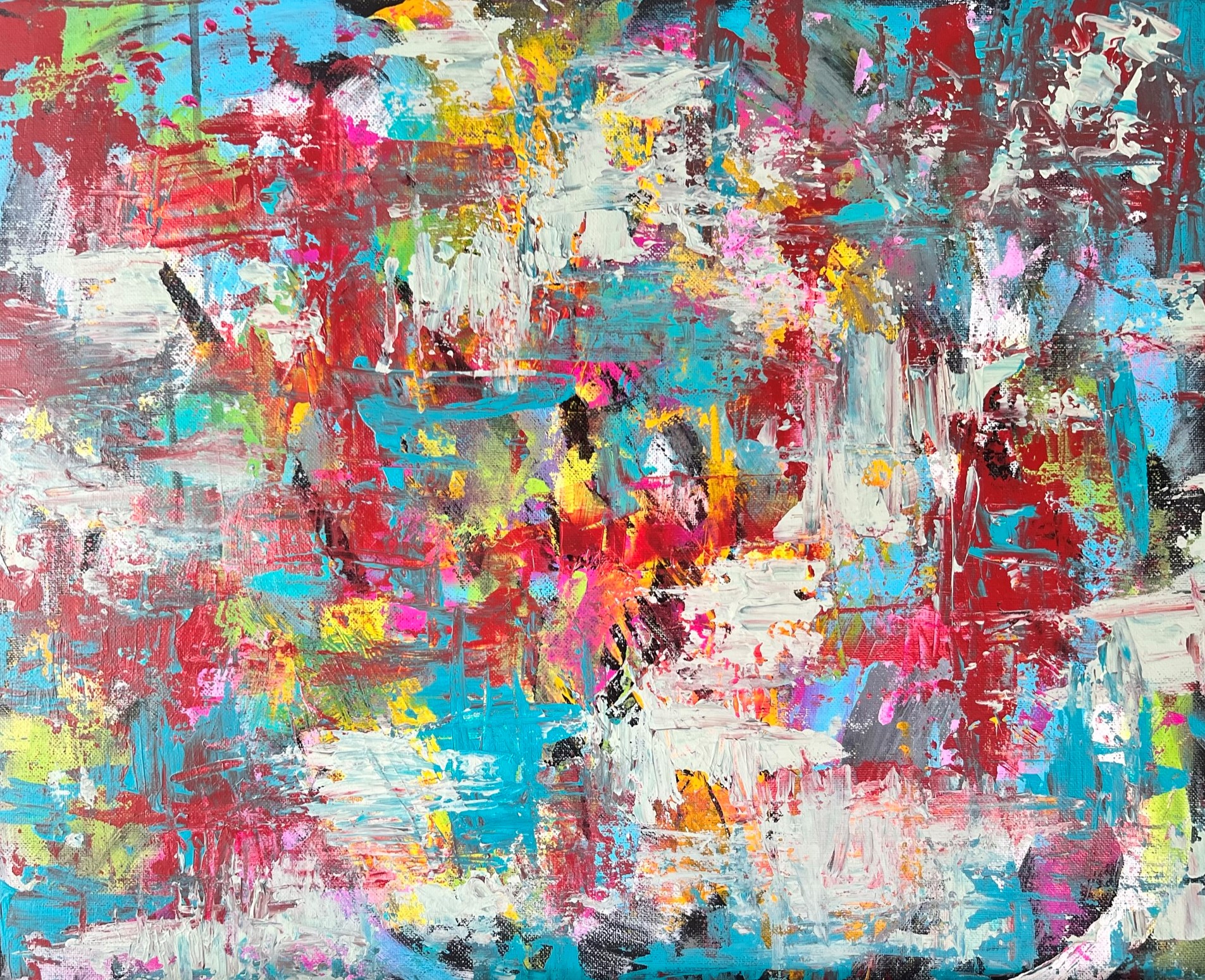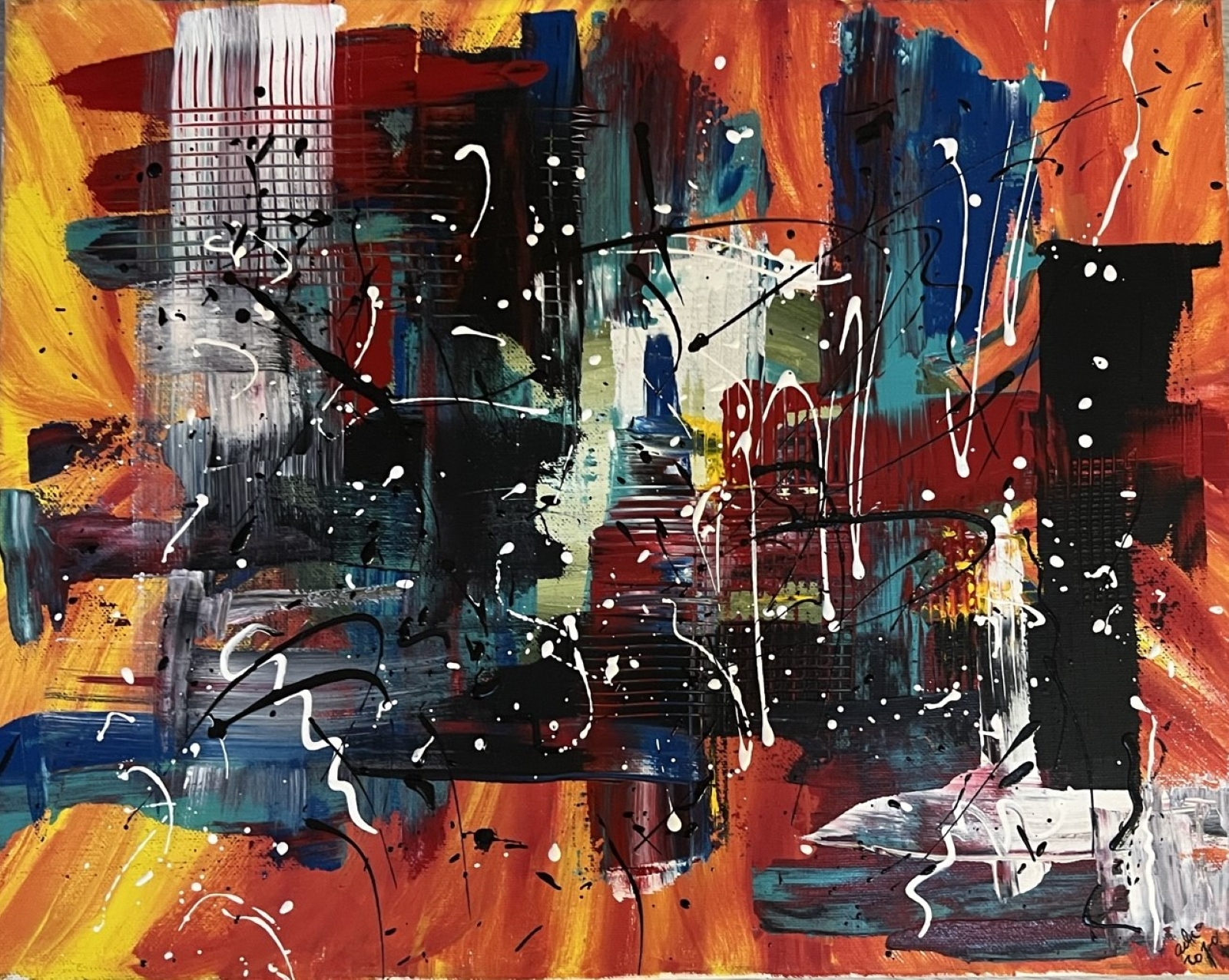 All of the feelings with bold reds and oranges in the background and blacks, blue and splashes of white in the foreground. City chaos, intense emotions, explosions of color and excitement. 22 x 28 Acrylic on Canvas Board