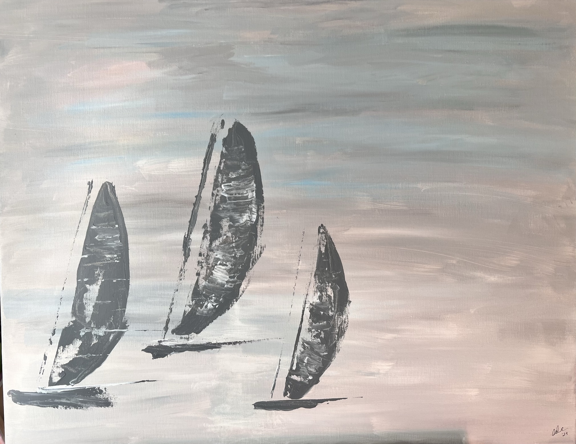 Ghost ships on a soft blue and grey background. 28x 22 Acrylic on Canvas Shipping is additional, based on zip code.