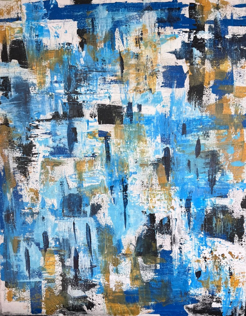 Splashes of rust, yellow, blue on black canvas. Look closely and you’ll see copper too. An intricate piece that always surprises. 24 x 16 Acrylic on Canvas Shipping is additional, based on zip code.