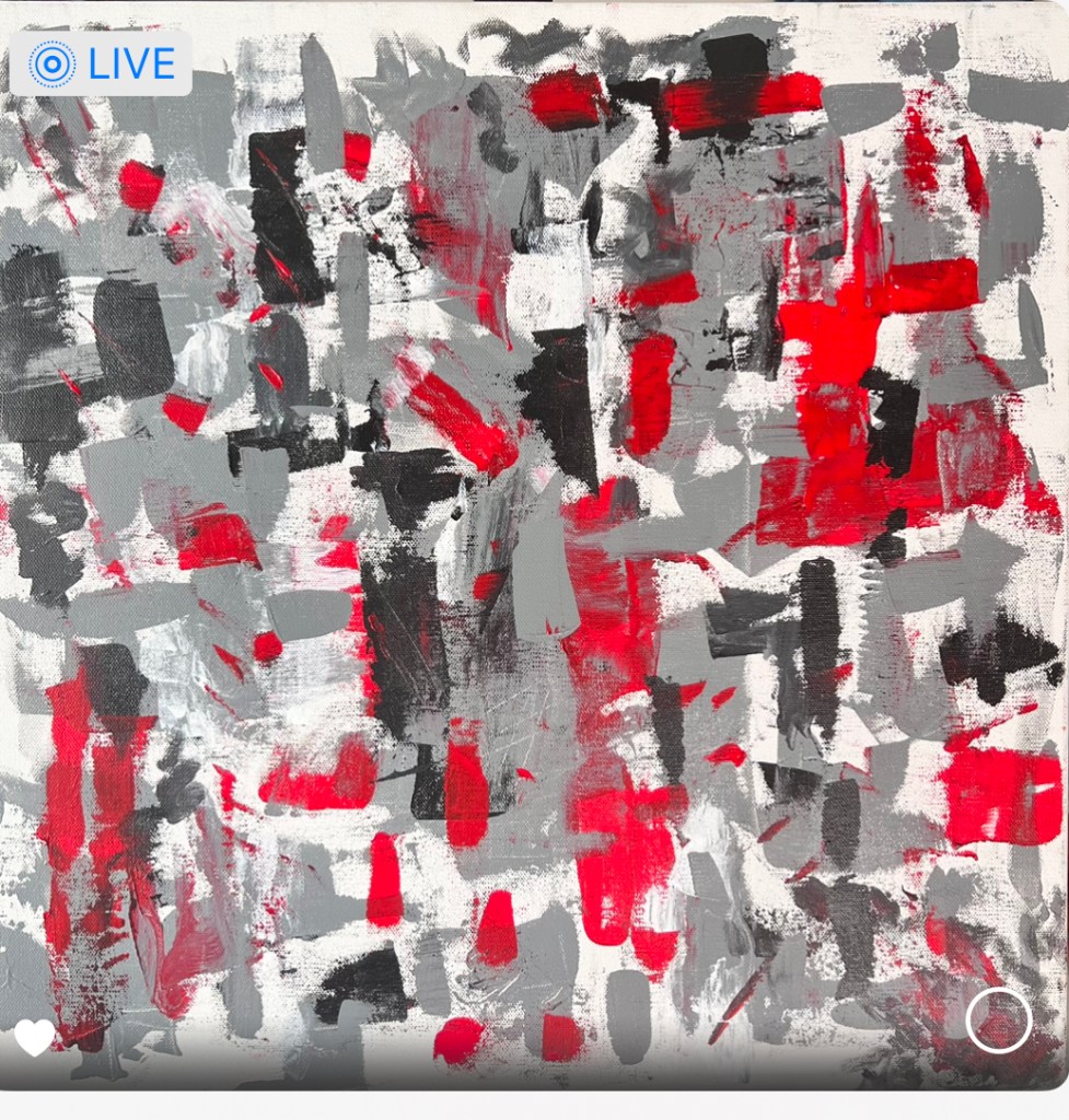 Grey, red and black strokes with confetti. Acrylic on canvas. 20x20x1