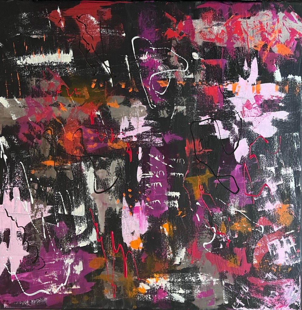 Neon oranges and pinks on black canvas. Acrylic on canvas. 20×16