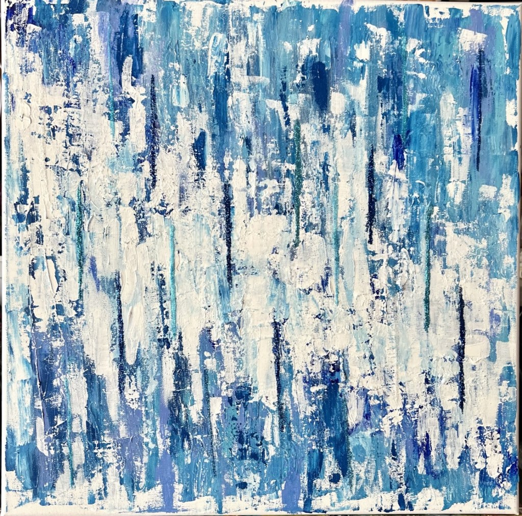 A captivating work of art that immerses viewers in a sea of tranquil blue hues. The canvas is dominated by shades of blue and grey, creating a sense of calm and introspection. The artist skillfully employs various shades and tones of blue, ranging from the ethereal lightness of the sky to the profound depth of the ocean, with pops of yellow and surprises like the black, red and white “ladder” in the upper right corner. 20 x 20 Acrylic on Canvas Shipping is additional based on zip code.