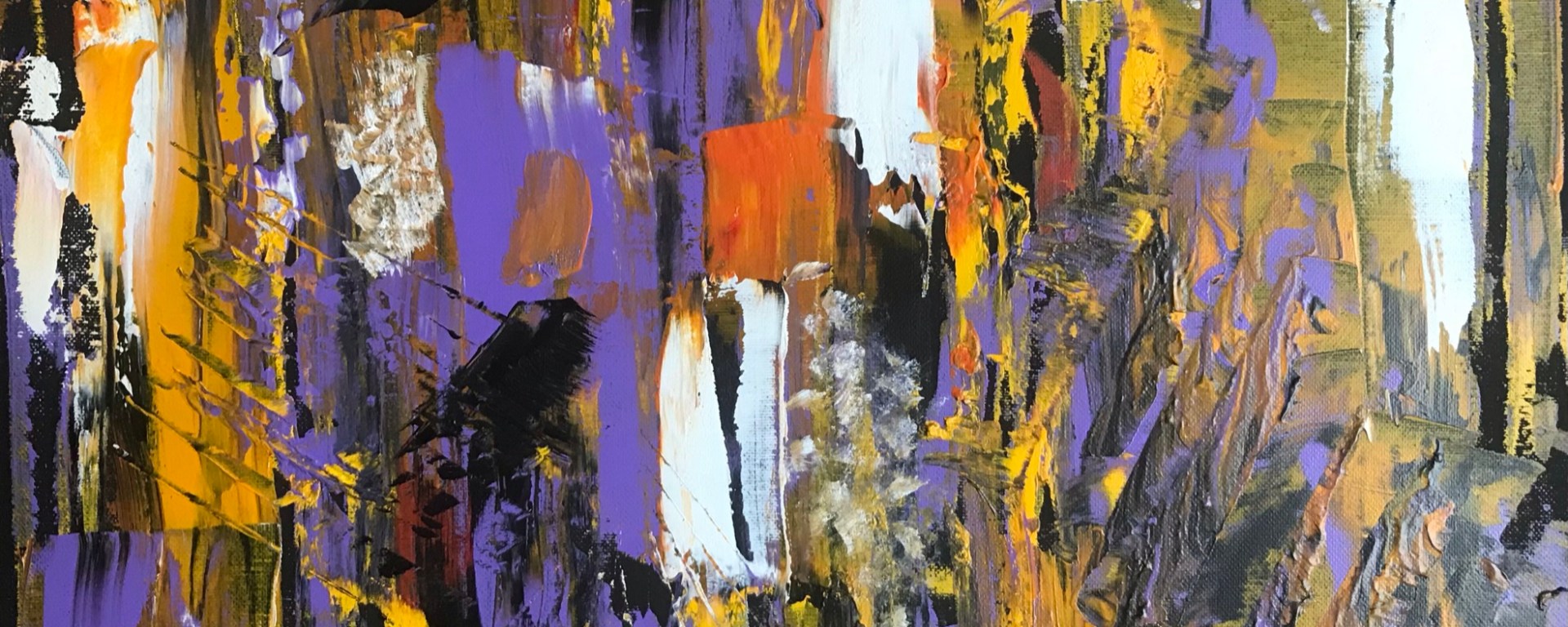 All of the feelings with bold reds and oranges in the background and blacks, blue and splashes of white in the foreground. City chaos, intense emotions, explosions of color and excitement. 22 x 28 Acrylic on Canvas Board